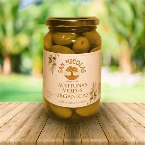 Aceitunas orgánicas verdes de Olivares San Nicolás. Presentación en frasco de vidrio envasada en origen.